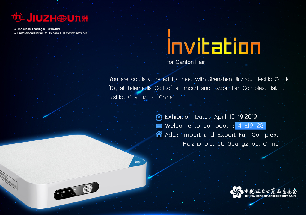 第125屆中國(guó)進(jìn)出口商品交易會(huì),將于2019年4月15-19日,在廣州琶洲會(huì)展中心舉行。深圳九洲電器將攜數(shù)字電視產(chǎn)品亮相廣交會(huì),歡迎客戶(hù)和合作伙伴光臨九洲展位!