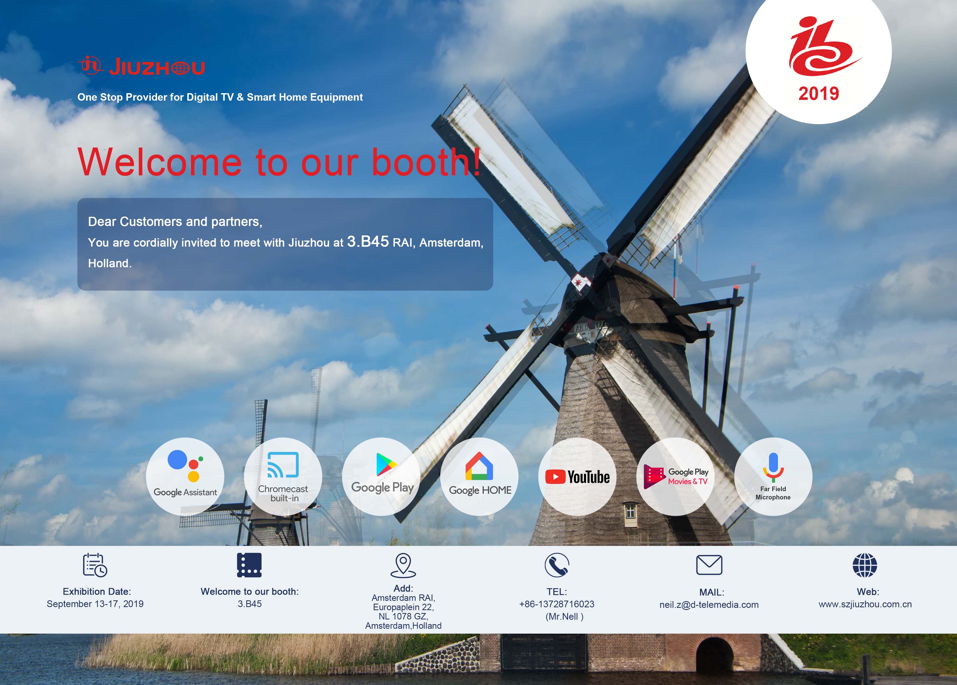 2019年荷蘭廣播電視設備展覽會(IBC),將于2019年9月13-17日在荷蘭阿姆斯特丹國際展覽中心舉行。深圳九洲電器將攜數(shù)字電視與智能家居產品亮相荷蘭IBC展會。